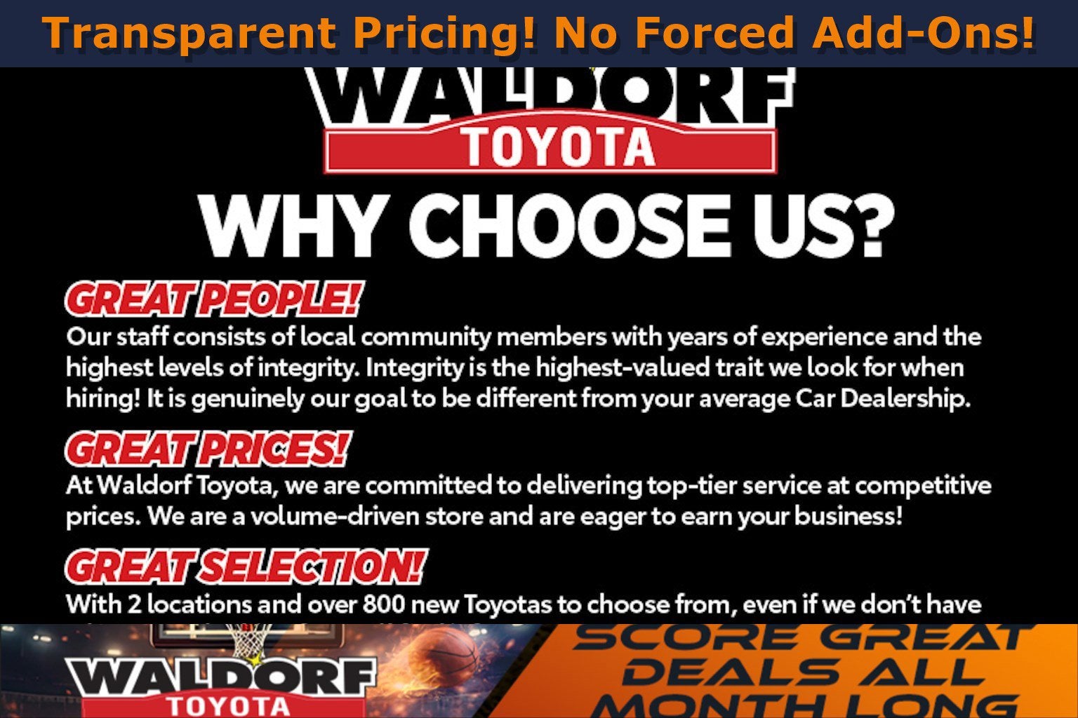 We strive to provide accurate information, but please verify options and prices before purchasing. All vehicles are subject to prior sale and financing is subject to approved credit. All discounted new vehicle internet prices plus Tax, tags, destination and $799 MD processing fee. Internet pricing may include all rebates and incentives such as Trade Assistance and may not be compatible with special factory finance promotions. Manufacturer financing may be required on select models for a portion of the rebates. You may not qualify for all incentives. Internet Sales Prices are subject to change as well as rebates and incentives may vary based on your zip code. Additional rebates and incentives such as Military or College Graduate programs may apply to those who qualify. Prices are valid based on current manufacturer incentive program time periods, which vary by model. See dealer for details. By providing your phone number, you consent to receive occasional SMS or voice calls from us regarding our products, services, and promotional offers. Standard messaging rates may apply. The Manufacturer's Suggested Retail Price excludes tax, title, license, dealer fees and optional equipment. Dealer sets final price.